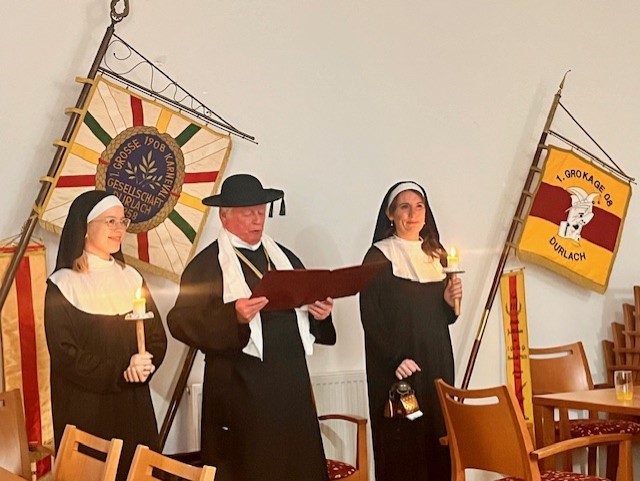 Auch das traditionelle Heringsessen am Aschermittwoch durfte natürlich nicht fehlen (vielen Dank den Sponsoren Thorsten Küchel, Monika Müller, Sauder Menü Bruchsal und Café Kehrle). Im Vereinsheim kamen die Mitglieder zusammen, um bei einem köstlichen Mahl gemeinsam den Abschluss der Faschingssaison zu feiern. Dabei erwartete uns eine besondere Besinnung, als Padre Hans Pietro (Hans Matz) und seine auserwählten Nonnen Gelsomino (Jasmin Schäuble) und Filino (Philine Thamm), sie hat auch unser diesjähriges Motto gebastelt, uns dazu ermutigten, vermehrt auf analoge Kommunikation (Briefe, Telefax...?!?) zu setzen. Außerdem gab es eine Anmerkung zu den Einzugsmärschen beim Ordensabend. Diese waren nicht "traditionell genug", kamen allerdings von der Lyra ;-). Die konstruktive Kritik nehmen wir ernst und werden uns bemühen, die Traditionen unseres Vereins in Zukunft noch stärker zu pflegen.