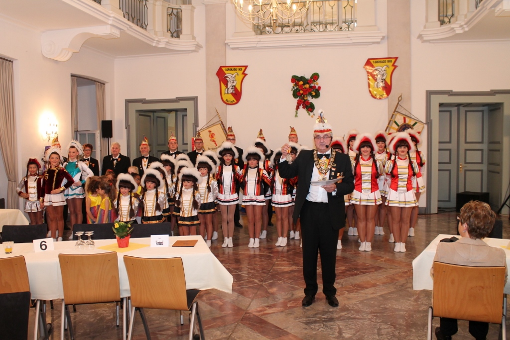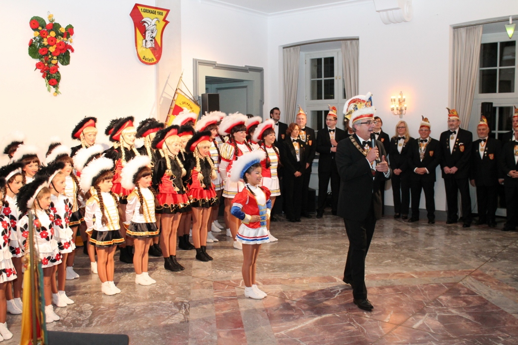 Am 24.11.14 war es wieder soweit. Die GroKaGe lud zum internen Ordensabend in die Karlsburg ein. Und siehe da, die GroKaGe-Familie erschien zahlreich. Präsident Helmut Ziegler führte gekonnt durch den Abend und konnte hierbei aus dem Vollen schöpfen. Sämtliche Tanzgarden und Tanzmariechen waren vertreten und präsentierten ihre Tänze. Selbstverständlich wurden wieder jede Menge Orden an die Mitglieder überreicht. Den Jahresorden ziert in diesem Jahre der “Brunnen an der Talstation”. Besonders hervorzuheben ist die Ehrung für Gerti Reichert. Gerti war in den fünfziger Jahren Prinzessin der GroKaGe und ist nun seit 60 Jahren Mitglied unserer Gesellschaft!