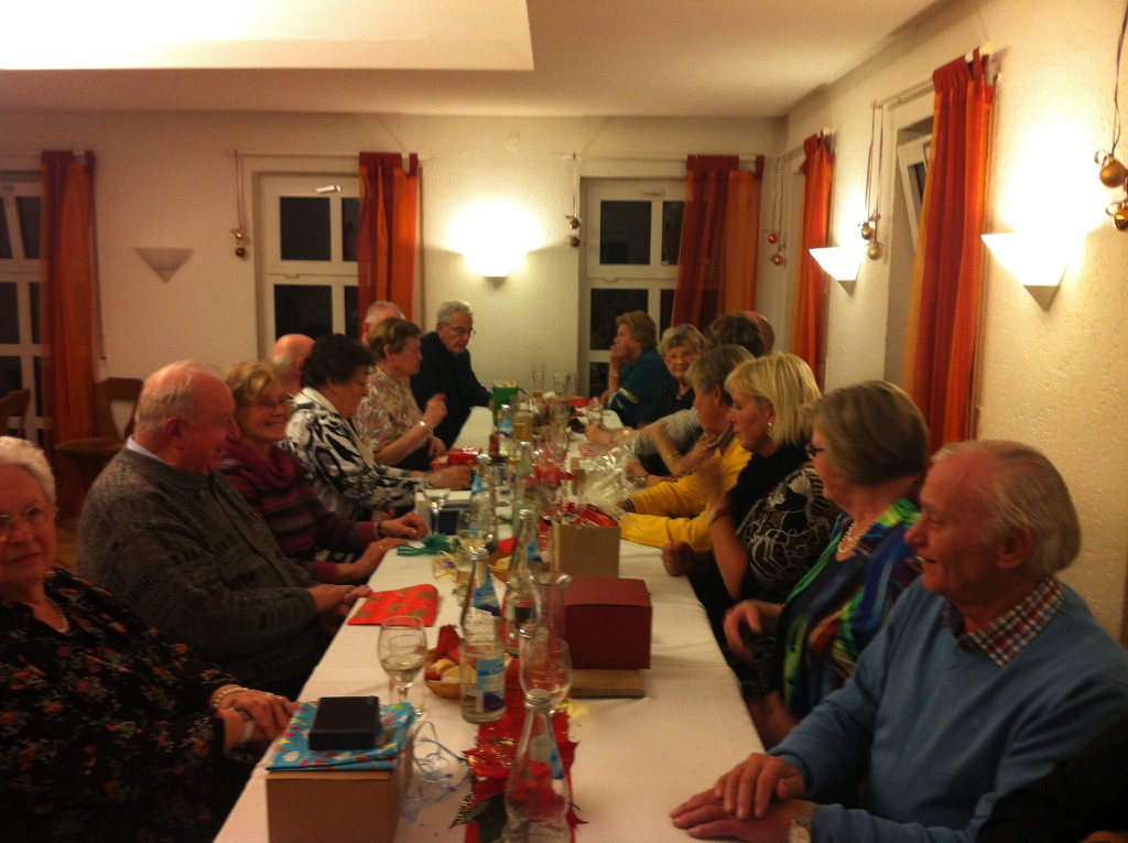 Recht zahlreich folgte der Senat der Gro-Ka-Ge unserer Einladung zur Weihnachtsfeier. In dem weihnachtlich eingedeckten Nebenzimmer der TG-Aue verbrachten wir einen geselligen Abend. Nach einem gemeinsamen Essen und einem launigen Vortrag über eine betriebliche Einladung zur Weihnachtsfeier, die letztlich „in die Hosen ging“, wurde wieder, wie im letzten Jahr, gewürfelt, um an ein Weihnachtspäckchen zu kommen. Alle hatten ein Geschenk schön verpackt, und jeder überlegte, was wohl in diesem oder jenem drin sein mag.Es wurde gewürfelt, geschoben, nach links, nach rechts, endlich war eine Eins oder Sechs gewürfelt und die Auspackerei ging los. Manches oh oder ach war zu hören, aber auch manches Schmunzeln zu erkennen. Ob Brauchbares oder auch nicht, es war lustig, die Gesichter der Beschenkten zu sehen. Wir hatten eine fröhliche Weihnachtsfeier, und werden sicher auch für das nächste Jahr wieder eine planen. Die Resonanz hat uns gezeigt, dass wir einen guten Weg gefunden haben, um mit dem Senat, auch außerhalb der Gro-Ka-Ge, Aktivitäten durchzuführen.