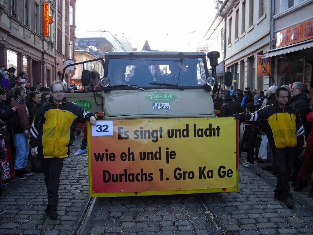 Auch beim Karlsruher Umzug am 04.03.2014 meinte es das Wetter gut mit der Narrenschar. Mehr als 200.000 Zuschauer waren in den Karlsruher Straßen trotz vieler Kombi-Baustellen unterwegs, um das närrische Treiben zu beobachten. Mittendrin im Geschehen war selbstverständlich die GroKaGe-Familie. Nach dem turbulenten Tag kam am Abend eher traurige Stimmung auf. Am Durlacher Rathaus wurde die Fastnacht gemeinsam mit den anderen Durlacher Vereinen beerdigt.