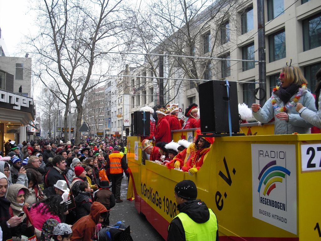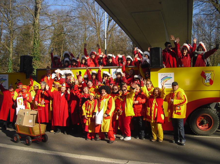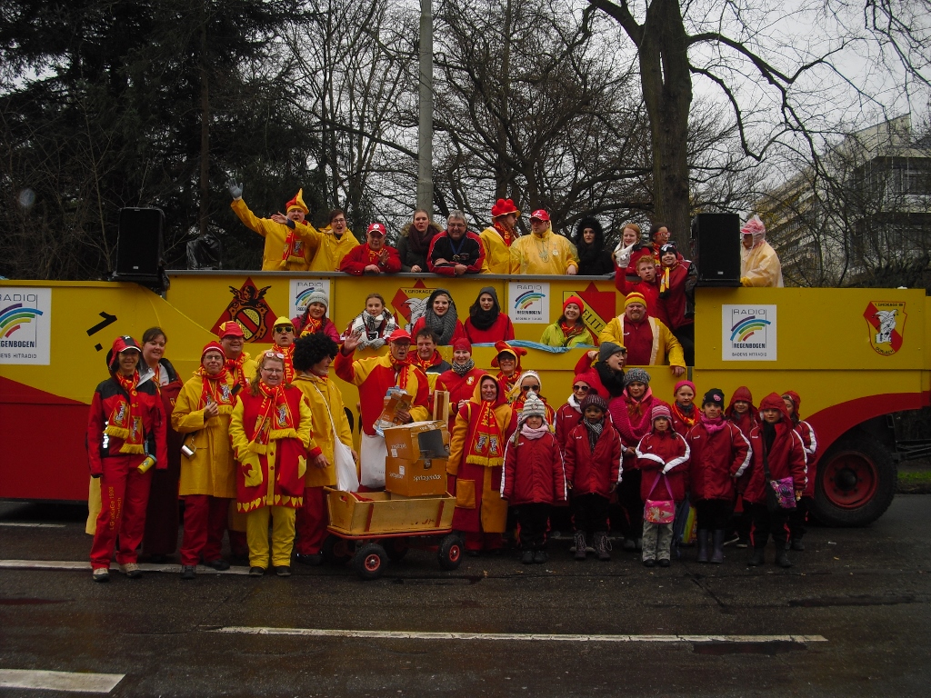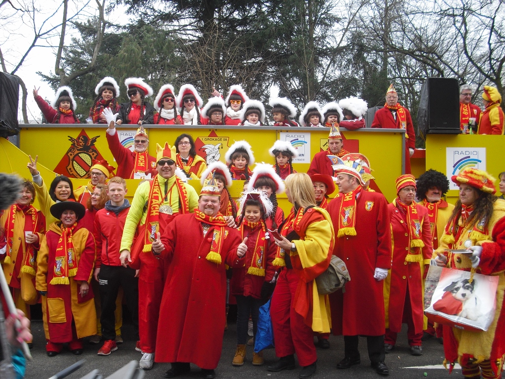 Am 09.02.16 stand für die GroKaGe der Faschingsumzug in Karlsruhe auf dem Programm. Gemeldete Regengüsse und Winde blieben glücklicherweise zum großen Teil aus. So hatte die GroKaGe Gelegenheit sich dem Publikum gut gelaunt zu präsentieren. Der Zuschauerandrang war mit 100.000 Besuchern nicht ganz so groß wie in den Vorjahren, was sicherlich dem Wetter geschuldet war. Dieses war auch der Grund dafür, dass die abendliche Fastnachtsverbrennung nicht auf dem Rathausplatz sondern im Gewölbekeller des Rathauses in Durlach stattfand. So konnte die Puppe nicht, wie gewohnt verbrannt werden, sondern wurde unter lautstarkem Wimmern der anwesenden Narrenschar kurzerhand aus dem Raum getragen.