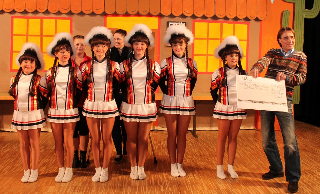 Unsere Mädels der Turmberggarde präsentieren seit dieser Kampagne stolz ihre neuen Kostüme. Diese wurden im Wesentlichen durch die großzügige Geldspende der BBBank finanziert. Hierfür bedankt sich die GroKaGe ganz herzlich! Das Bild zeigt den Filialleiter der BBBank Filiale Durlach, Herr Rainer Wolf, bei der symbolischen Scheckübergabe während des Kinderfaschings in der Festhalle.