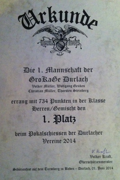 Beim Schützenfest der SG Durlach, am 01.06.14, war die GroKaGe-Familie zum wiederholten Male sehr erfolgreich. So belegte unsere Damenmannschaft beim Pokalschießen der Durlacher Vereine einen tollen 3. Platz. Unsere Herrenmannschaft konnte sich sogar den 1. Platz sichern. Zudem wurde unser Kanzler, Christian Müller, zum besten Schützen dieses Wettbewerbs gekürt.