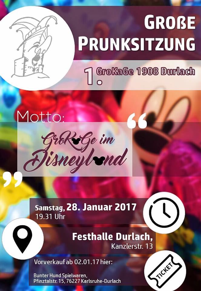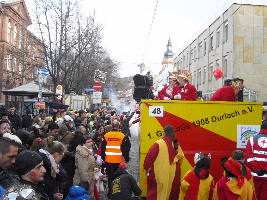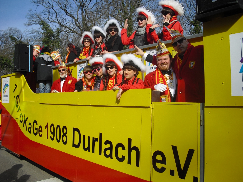 Am 07.02.16 fand der Durlacher Umzug statt. Ca. 90.000 Narren säumten die Durlacher Straßen und feierten die teilnehmenden Gruppen und natürlich sich selbst. Pünktlich zum Umzugsbeginn kam die Sonne zum Vorschein und vertrieb den unangenehmen Nieselregen. Selbstverständlich war auch die GroKaGe mit Ratswagen, Kinnerschees und einer Fußgruppe am Start. In der Folge ließ die GroKaGe-Familie den Tag, wie gewohnt, im Altenheim am Blumentor ausklingen. Hierfür vielen Dank an unseren Senator Thorsten Küchel. Am Dienstag folgt nun noch der Karlsruher Umzug. GroKaGe-Helau!