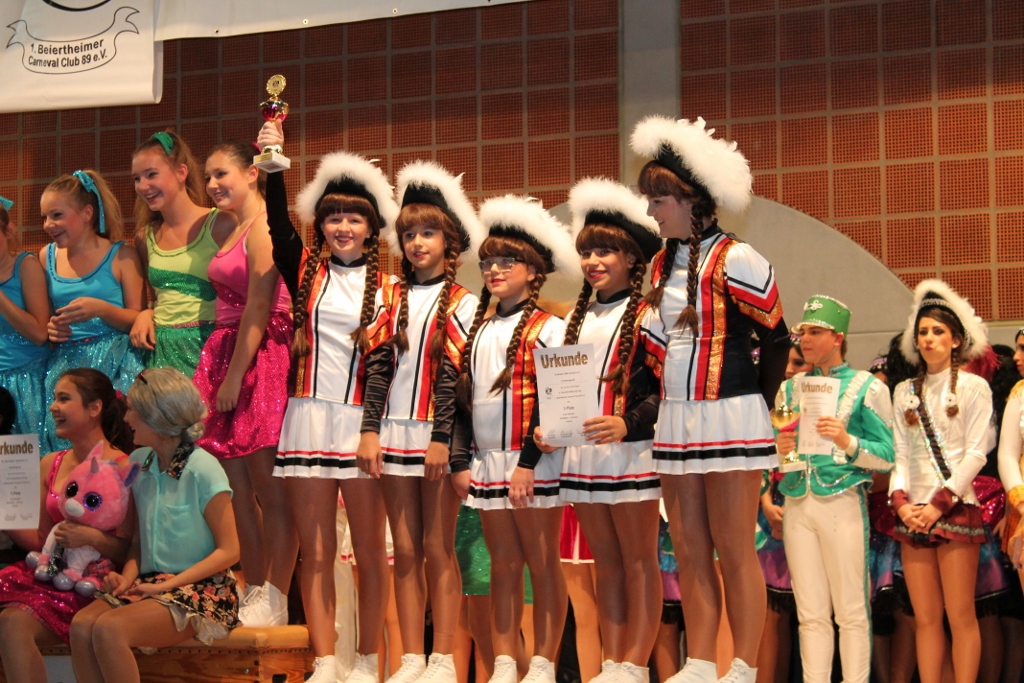 Auch das Freundschaftsturnier des Beiertheimer CC in der Lustgartenhalle zu Hohenwettersbach am 03.11.13 war für die GroKaGe ein äußerst erfolgreicher Turniertag. Unser Junioren-Tanzmariechen Alexa sicherte sich bei Ihrem allerersten Turnierauftritt einen bemerkenswerten 9. Platz. Die Senatsgarde schrammte knapp am Podestplatz vorbei und belegte den 4. Platz bei den Aktiven. Aufs Podest tanzten sich unser Jugend-Tanzmariechen Dana mit einem tollen 3. Platz sowie unsere Jugendgarde Hexenstäffele, die den 2. Platz feiern konnte. Auch unser Tanzpaar Denise und Vincent waren in Beiertheim wieder auf der Bühne zu bewundern. Nach dem Turniersieg in Reilingen vom Samstag traten sie jedoch ohne Konkurrenz an, wussten aber trotzdem zu gefallen. Das Bild zeigt unsere Hexenstäffele beim Eimarsch.