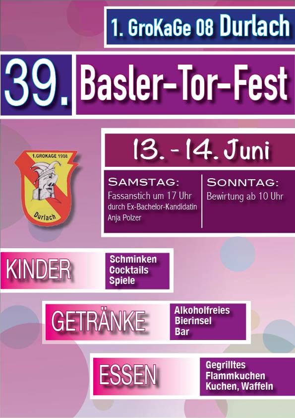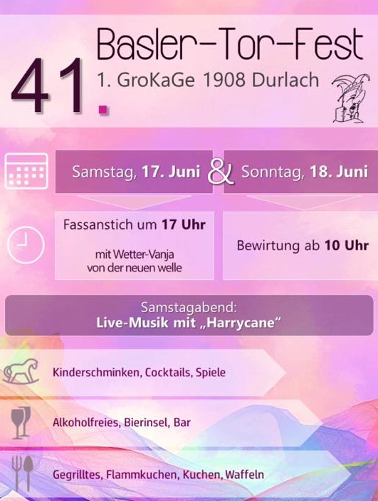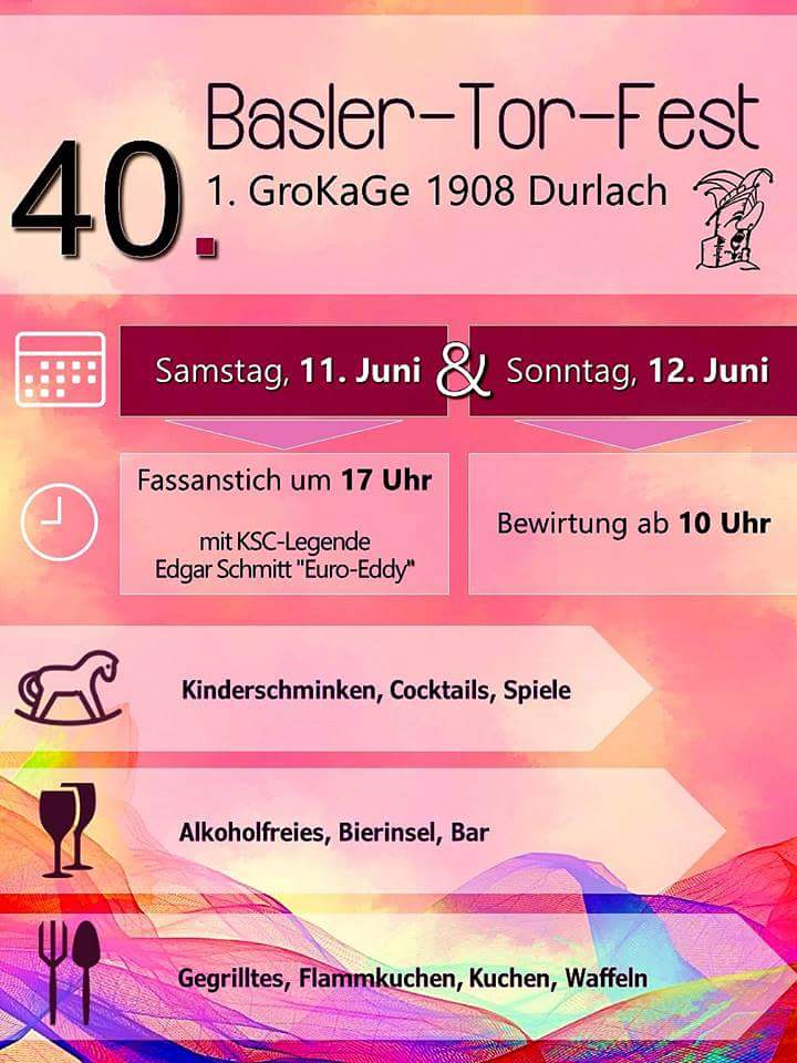Am 11. und 12.06.16 findet unser 40. Basler-Tor-Fest statt. Die GroKaGe verwöhnt, wie gewohnt, mit Speis und Trank und freut sich sehr auf Euren Besuch. Der Faßanstich findet am Samstag um 17.00 Uhr statt. Dieser wird in diesem Jahr durch den Uefa-Cup-Helden des KSC, Edgar Schmitt, genannt Euro-Eddy durchgeführt.