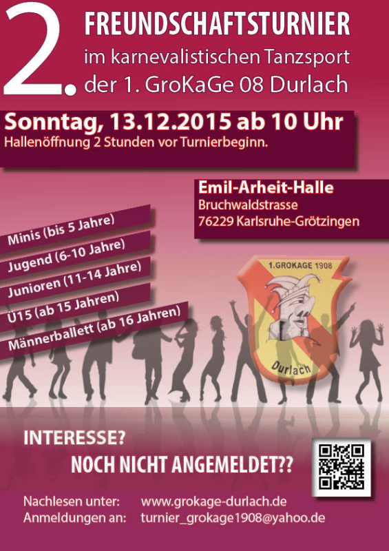 Nach der geglückten Premiere im letzten Jahr richtet die GroKaGe auch im Jahr 2015 ein Freundschaftsturnier im karnevaltistischen Tanzsport aus. Dieses findet am 13.12.15 in der Emil-Arheit-Halle in Karlsruhe-Grötzingen statt. Wir freuen uns über zahlreiche Anmeldungen. Die dazugehörige Einladung, Ausschreibung und das Anmeldeformular könnt Ihr durch Klicken downloaden.