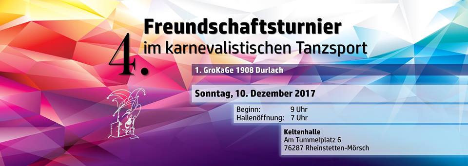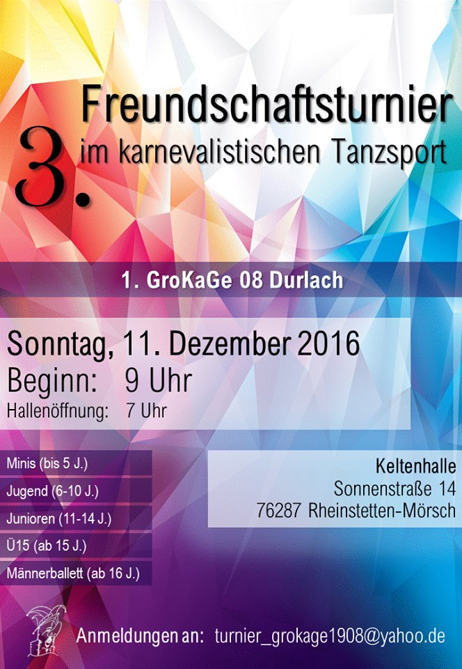Am 11.12.2016 richtet die GroKaGe ihr 3. Freundschaftsturnier im karnevalistischen Tanzsport aus. In diesem Jahr wird der Austragungsort die Keltenhalle in Mörsch sein. Wir freuen uns über zahlreiche Anmeldungen. Die dazugehörige Einladung, Ausschreibung und das Anmeldeformular könnt Ihr durch Klicken downloaden.