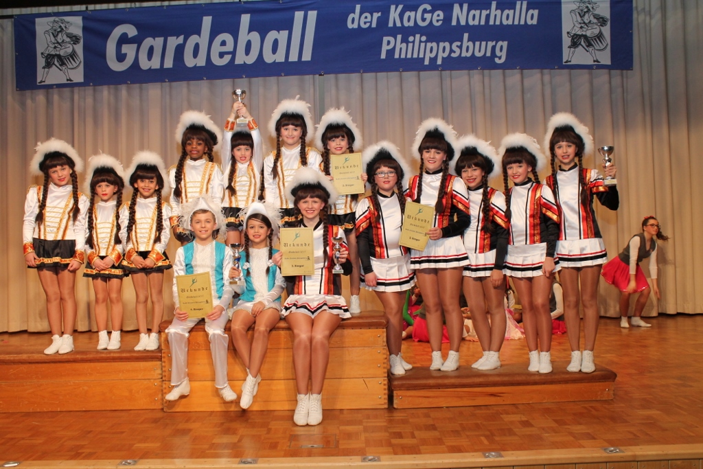 Beim Freundschaftsturnier bzw. Gardeball am 06.01.14 in Philippsburg waren unsere Solisten erneut erfolgreich. So belegte unser Jugendmariechen Dana einen sehr guten 2. Platz. Unser Junioren-Tanzpaar war sogar in doppelter Hinsicht siegreich. Neben dem Triumph beim Paartanz ertanzten sich sowohl Denise als Mariechen, als auch Vincent als Tanzmajor ebenfalls den ersten Platz. Darüber hinaus durfte Denise noch den Pokal für die Tageshöchstwertung entgegen nehmen. Die Platzierungen unserer weiteren Mariechen waren auch bemerkenswert. Julia reihte sich bei der Jugend auf dem 4. Platz ein, bei den Junioren belegte Michelle den 5. und Alexa den 6. Platz. Insgesamt war dies somit wieder eine tolle Teamleistung. Als nächstes stehen nun die Badischen Meisterschaften in Waghäusel an. Allen Solisten und Tanzgarden wünschen wir dort viel Glück und Erfolg. Das Bild zeigt die GroKaGe-Mariechen nach der Siegerehrung.
